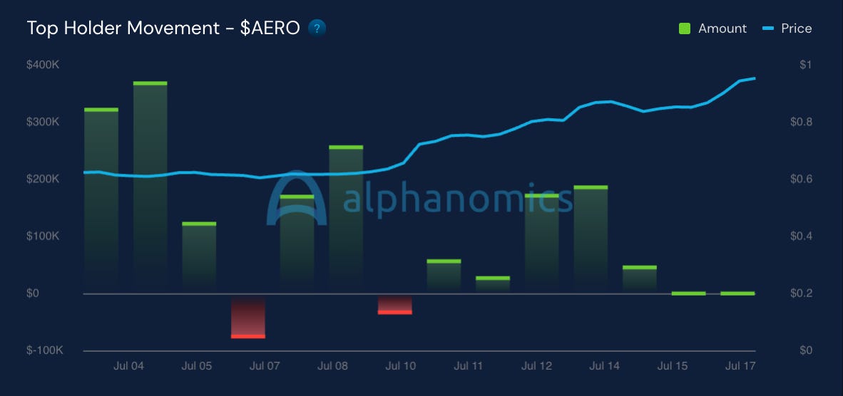 🚀 AERO Takeoff: Aerodrome, the premier DEX and DeFi protocol on Base, has been on a remarkable streak, consistently generating massive volume and increasing rewards for AERO lockers. Coinbase Ventures, which announced their acquisition of a position in AERO earlier this year, continues to accumulate more, recently purchasing over $2.5 million worth of AERO from the market. Other top holders have also shown strong interest, accumulating over $2 million in AERO just this week.
