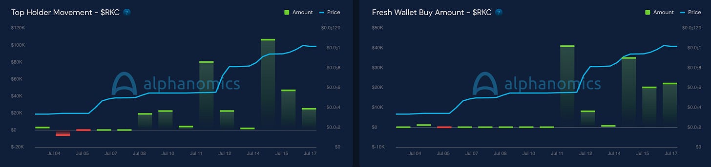 Bought $33k worth of RKC, a memecoin on Ethereum, recently. The price action on the token looks like its set to go another leg up with consistent increase in Top Holders and Fresh Wallets accumulation this week.
